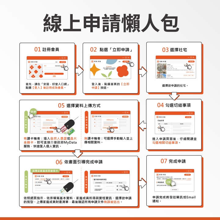 為提供民眾更便捷的申請體驗,中央社宅招租持續採24小時線上申請(安居好室入口網),並進一步簡化流程:
