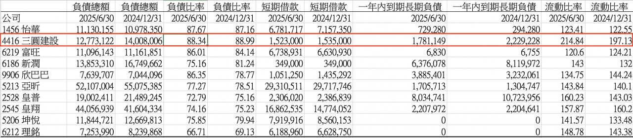 王光祥稱是個人財務問題,三圓也發重訊稱和公司無關,觀察三圓今年中的負債比88.34%與2024年底相較,並無明顯變動,馨傳不動產智庫執行長何世昌表示,建商因為需要借錢買土地、支付營造工程款,資產負債比介於50%-80%之間,超過80%以上有稍高一些。
