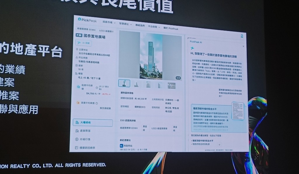 2024年土地與商用地產為4027億,其中31%是商業不動產。商業不動產的需求龐大,企業卻一直無法獲得第一手資訊。看好商機,方睿科技推出「純粹為商而生的地產平台」PickPeak,預計於明年第一季上架。