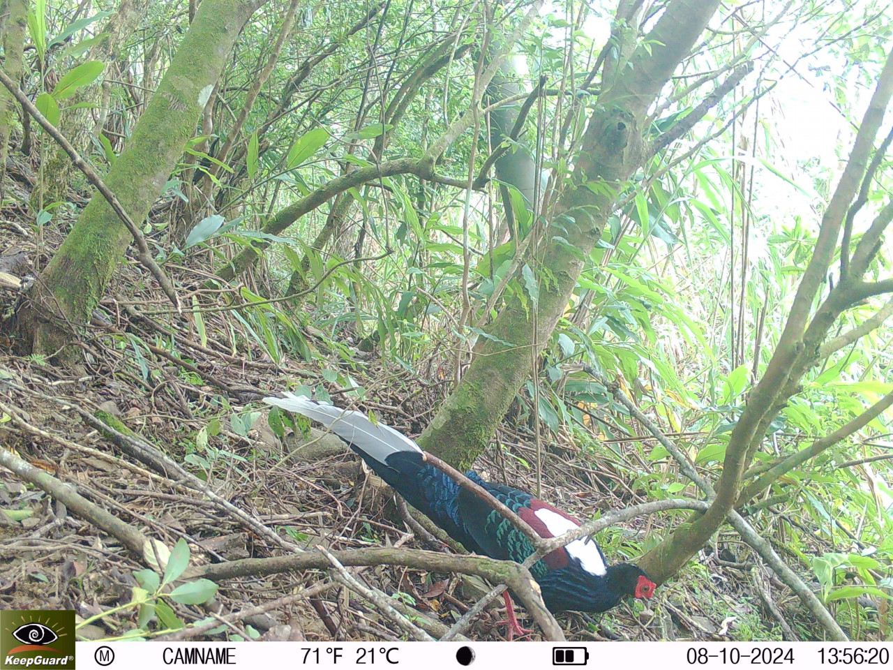 信義房屋也委託專業團隊進行生態監測,目前已完成四次調查。團隊透過自動相機與穿越線調查觀測山林活動,記錄到藍腹鷳的身影。