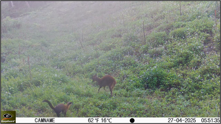 近一年的調查中,台灣山羌仍為最常出沒的哺乳類,而以草生地為主的地貌,也吸引大型哺乳類台灣水鹿頻繁現身。特別的是,團隊在自動相機畫面中記錄到三級保育類的黃喉貂追捕山羌的罕見場景。此外,造林地亦出現穿山甲蹤跡,這項重要保育指標顯示環境經造林後逐步恢復,生態鏈正重新活化。