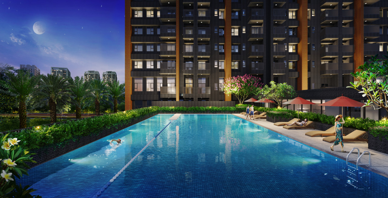夜幕下泳池燈光映照水景層次,社區規劃滿足機能需求,也為日常生活增添放鬆與度假般的儀式感
