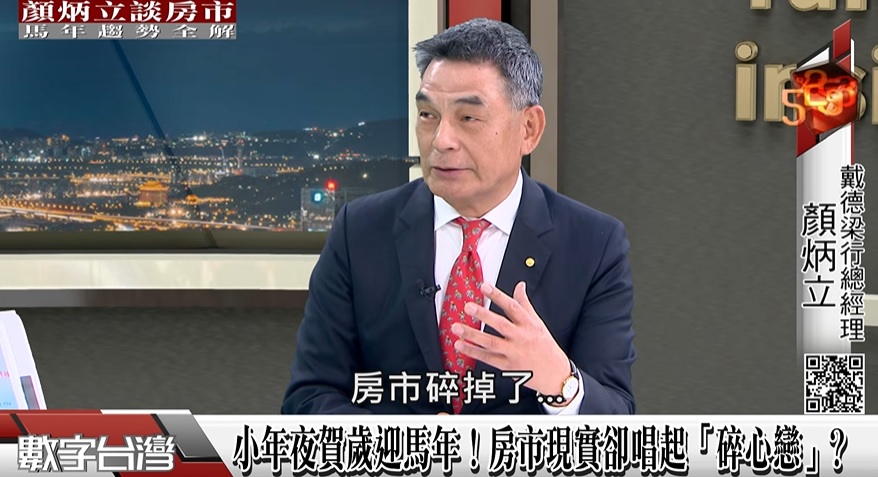 顏炳立在周日(2/15)播出的數字台灣節目,接受主持人謝金河訪談時表示,他認為2026年度國內房地產市場不太有投資客的空間,「你說這個市場要不要投資,我只有五個字,『謝謝再聯絡』」。