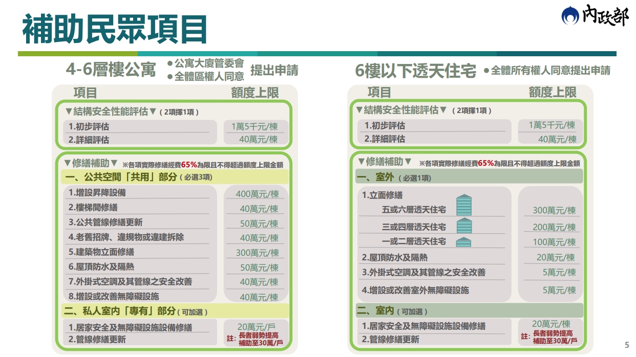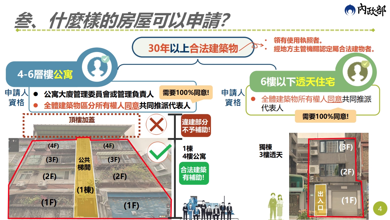 - 4-6層樓老舊公寓(不能是單一所有權人)、6層樓以下透天厝。