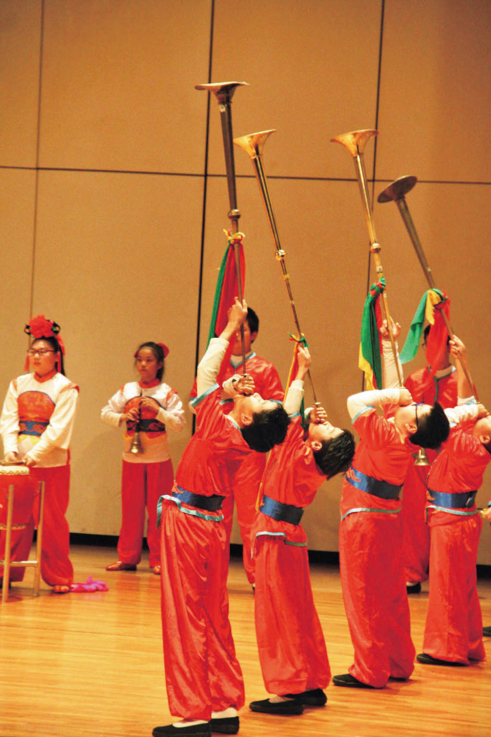 隨後,是金門中正國小鼓吹陣小將,以哨角、嗩吶奏響氣勢磅礴的喜慶之音,演出曲目《金蛇狂舞春添影》獲得滿場喝采。最後,由東勢國小弦樂音樂班演奏樂曲,在輕快的旋律高水準演出下,原來是客交流演出劃下熱烈且精采的句點。