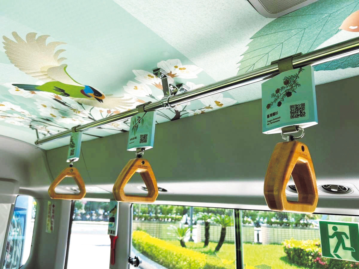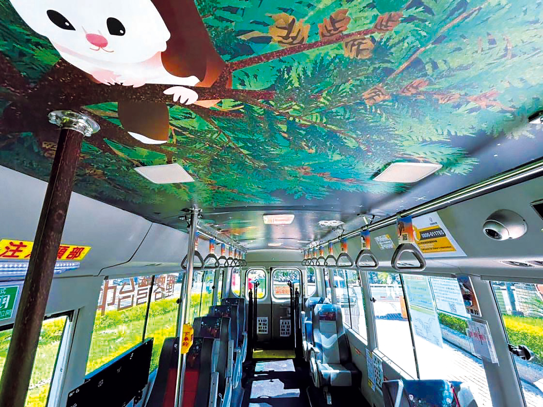 「889大雪山線」車上手拉環以台灣扁 柏特製,向森林致敬,車頂還有白面鼯 鼠塗裝可愛迎賓。