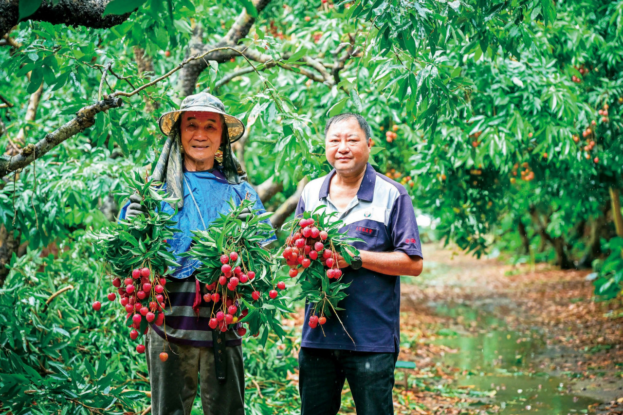 大里區農會供銷部場長謝瑞桐(右)與果樹產銷班第7班班長林調源表示,市府農業局輔導大里區農會打造「台中美荔」品牌,讓荔枝的價格與銷量都明顯提升。