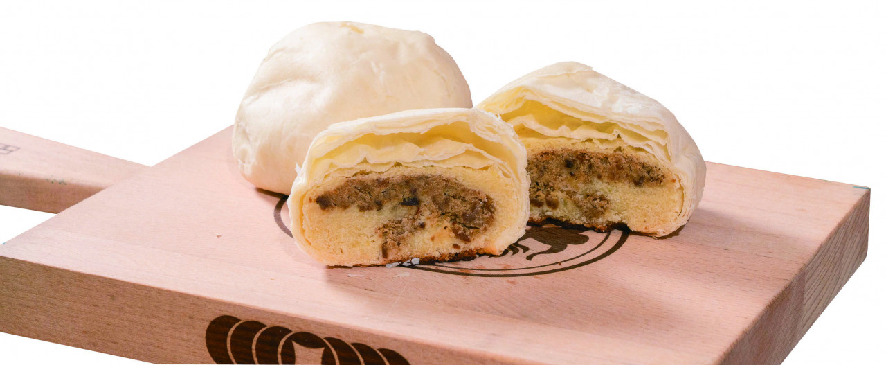 手藝精湛的呂水,不僅做餅好吃,他也觀察到,傳統糕餅用的帶殼綠豆餡雖然好吃,但「黑嚕嚕」的樣子不夠討喜,於是首創將綠豆去殼,用黃澄澄的綠豆仁做餡,再加入拌炒過的肥肉塊,不僅滋味迷人,賣相更好。