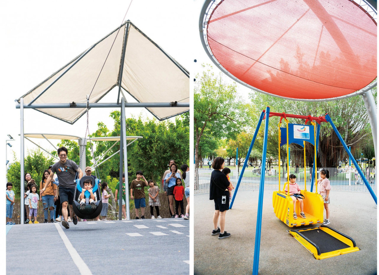 此外,今年6月全面完工的第三階段計畫,也增設輪椅盪鞦韆、輪椅旋轉盤等無障礙遊具,和溝通板、觸覺地圖、輪椅充電樁等輔助設施,確保身心障礙者的遊戲權,更在遊具旁增設遮陽、遮雨設施,讓整體空間更加開放舒適。