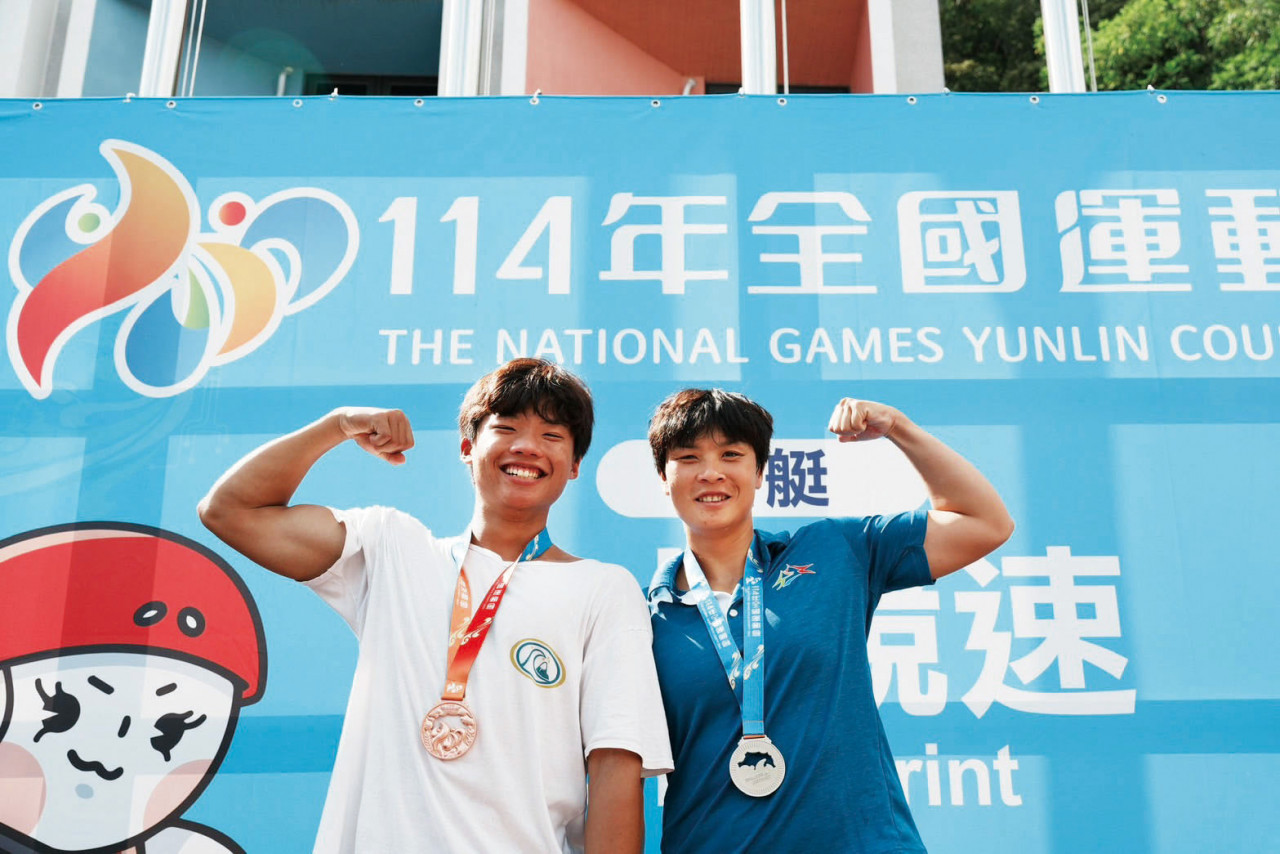 張筑涵(右)和她指導的惠文高中三年級顏澤鈞,在今年的全國運動會輕艇競速賽事中開心合影。