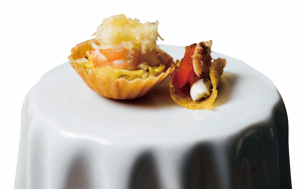 扎根台中,張皓福也把台中元素融入地坊的料理。比如用城門雞蛋糕講述台中城發展的起源;或是把特色麻芛化為創意料理,將烤過的地瓜泥填入小塔中,覆蓋麻芛軟凍後,再放上小魚乾;也把大麵羹的麵條拿去油炸,搭配以東泉辣椒醬為基底的特調醬汁。