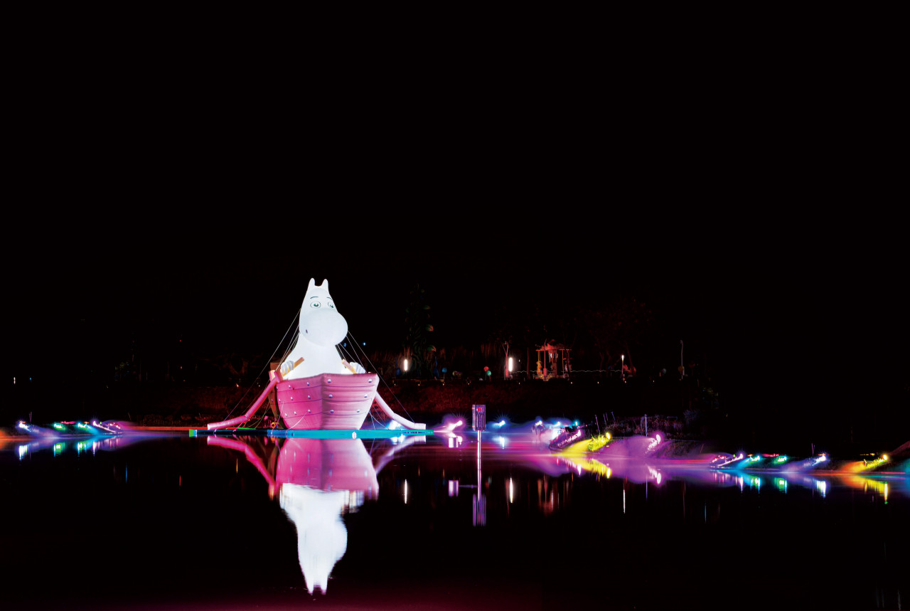 此外,「河畔奇航」燈區還有巨型姆明持槳划船,無辜呆萌的表情格外討人喜歡;「露營時光」則是8座姆明一族角色,愛釣魚的姆明爸爸、做園藝的姆明媽媽,以及其他在野餐、看書的森林精靈,共同徜徉在中央公園美麗的景致中。