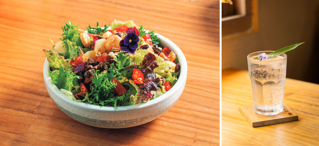 口感豐富的蔬果沙拉搭配馬告氣泡水,就是簡單又清爽的一餐。