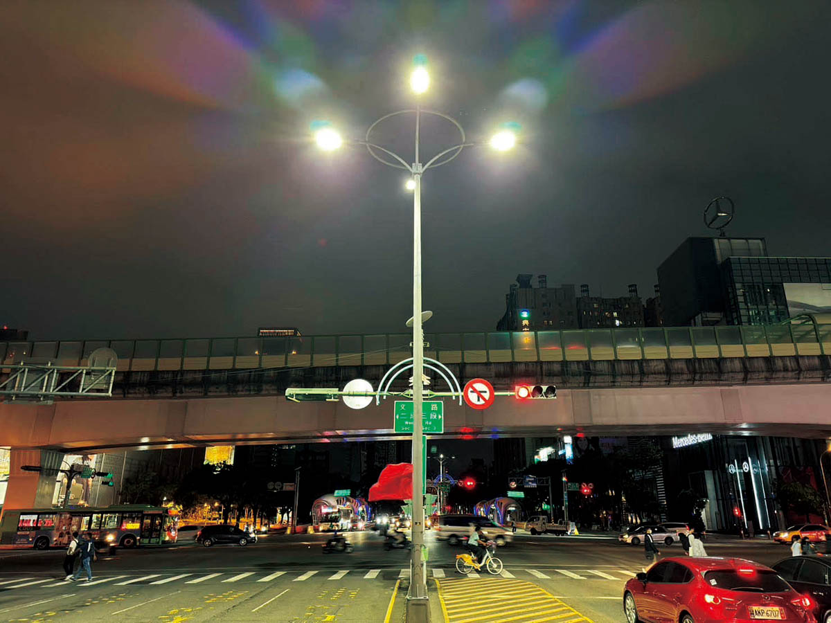 傳統鈉光燈色溫偏黃,顯色效果差,夜間容易產生視覺昏暗。早在2023年,市府建設局就針對車潮洶湧、人流量大或肇事率高的路口,替換LED燈具並設置「四臂燈桿」,可擴大路燈照明範圍,提升約25%的照明亮度,包括台灣大道、文心路、環中路、市政特區道路等主要幹道與路口都已更新完畢,守護行人通行安全,落實人本交通的核心價值。