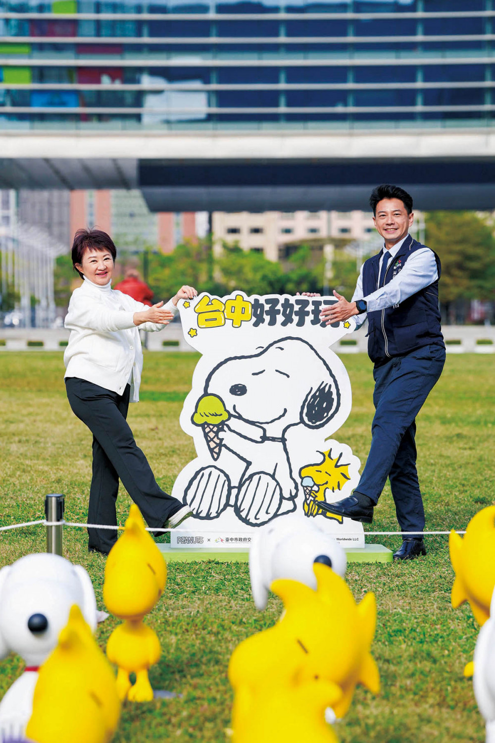 市長盧秀燕與交通局長葉昭甫於史努比交通安全主題區合影留念。