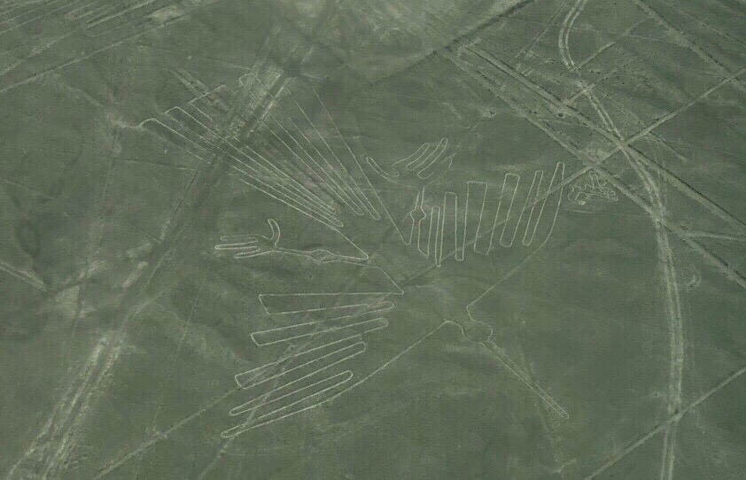 緊接著出現的是山坳裡、96公尺長的「蜂鳥」,長長的尖嘴對著群山,這是納斯卡線中另一個為人熟知的圖形。但,這裡不像是蜂鳥應該出現的地方啊!創作者到底在想什麼?這些圖形,令人不油自主的生起滿腹疑問。