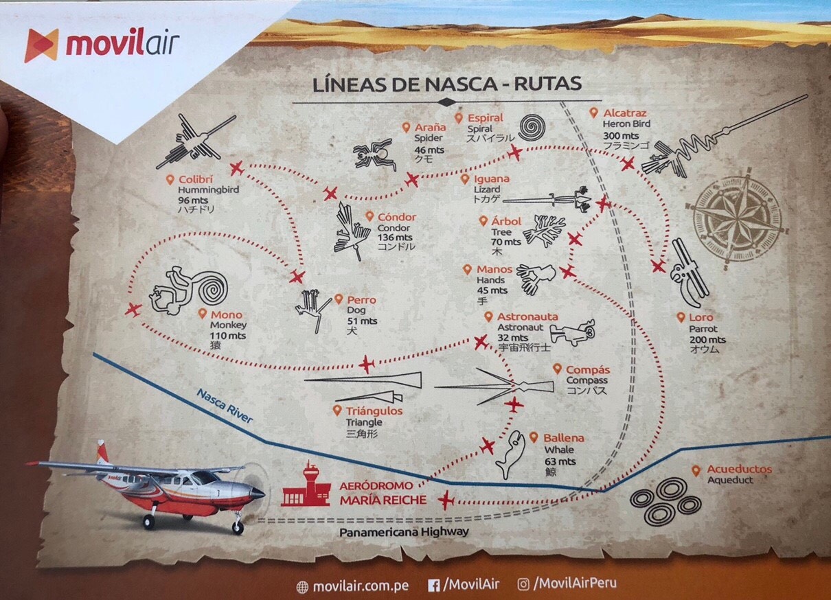 一班飛機只能乘坐12個人,依登機順序分別坐在左、右兩側。飛行30分鐘後才會抵達納斯卡線,約20分鐘繞完15個圖形後返航,行程約1個半小時。