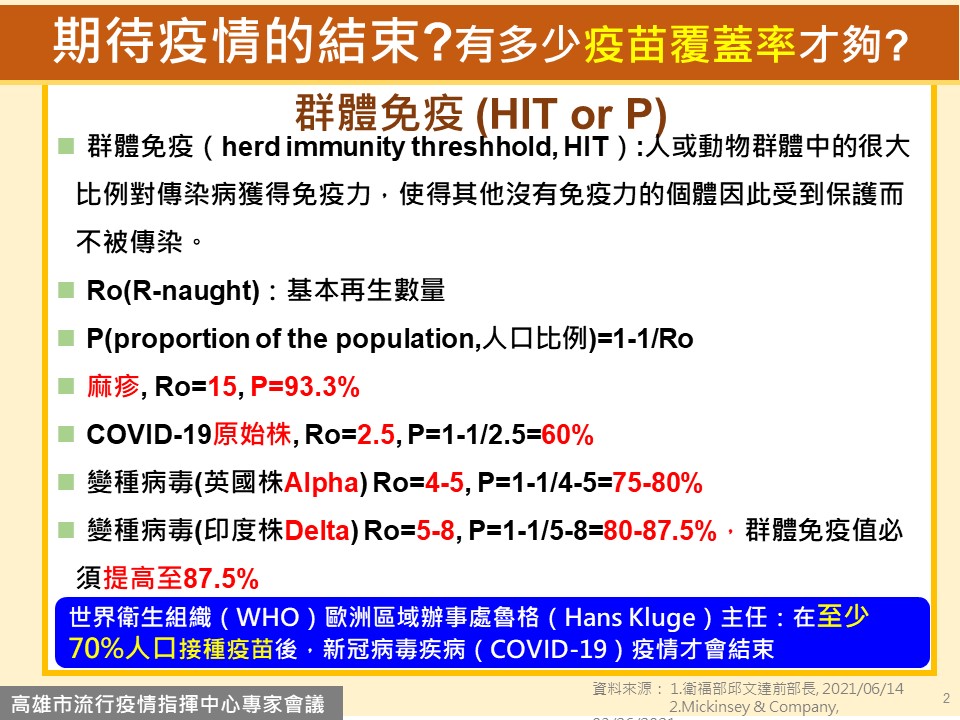 目前國內最多的英國株,R0值4-5,P值(人口裡面有多少比例已經有受到疫苗接種與覆蓋,也就是1-1/R0)必須要75-80%。