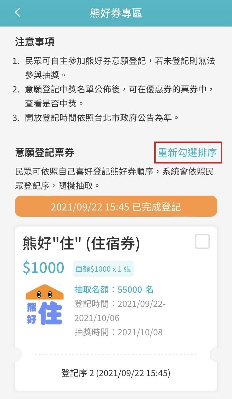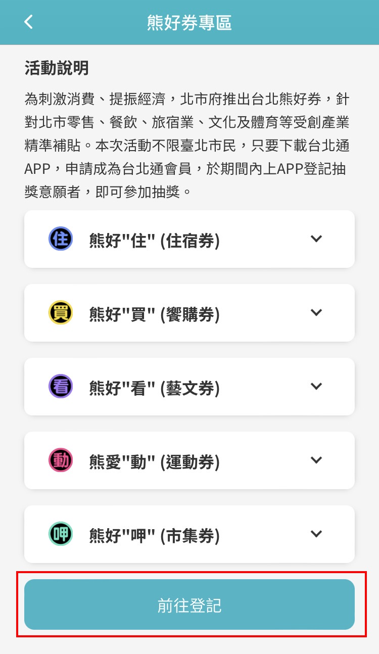 民眾只要自110年9月22日起至10月6日止,都可上台北通APP進行意願登記,北市提供超過100萬份的「台北熊好券」—包含住宿券、饗購券、藝文券、運動券及市集券,共5種票券預計10月8日在律師的見證下,公開線上抽獎。