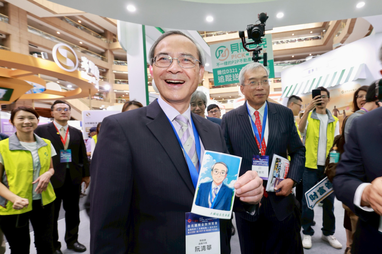▲財政部政務次長阮清華蒞臨2025台北國際金融博覽會。在土地銀行攤位體驗AI生成照片,並聽取土地銀行防詐的成果。(吳東岳攝影)