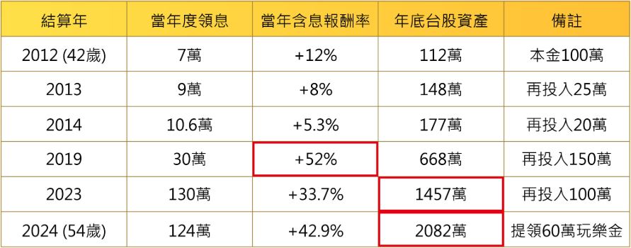 這種底氣來自他親手打造、完美對應台股市場的-「深度價值投資法」,用真金白銀實踐摸索十數年的安心策略,多年來無論碰到什麼大風大浪,他實際收入口袋的股息,或更貼切的說是「給家人的日常生活費」始終保持穩健增長。