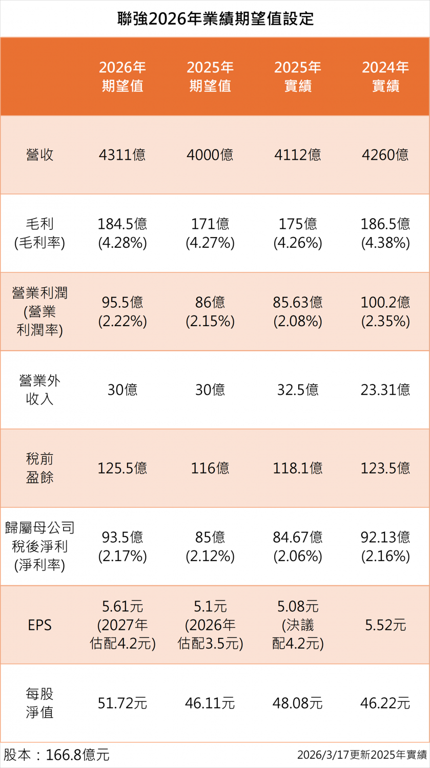 最後,我們著手來設定聯強2026年業績期望值。我們是以假設2026年營收成長5%的基礎上去設算。推算之後,對聯強2026年EPS期望值設定為5.61元,並對2027年配息期望值設定為4.2元。