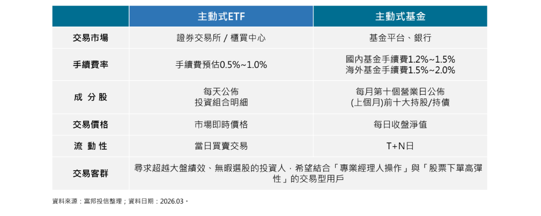 若從產品機制來看,「主動式ETF」與「傳統主動型基金」之間也存在明顯差異。