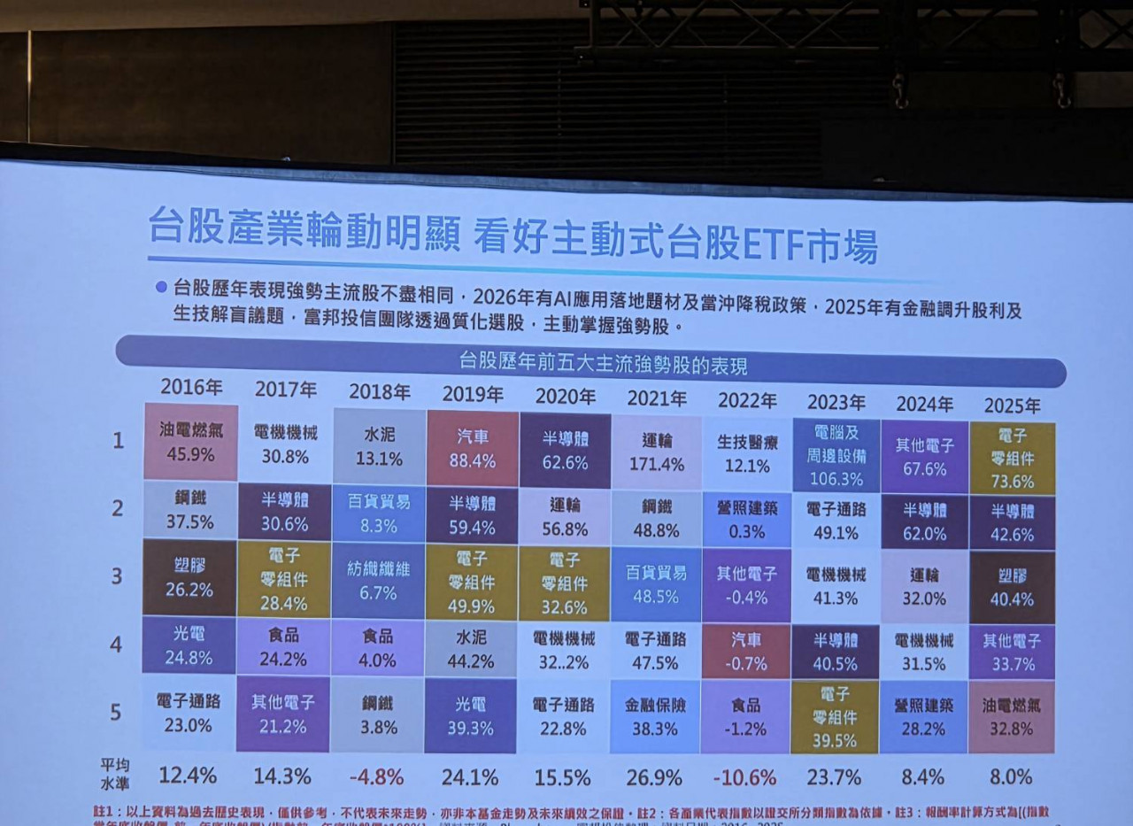 「每一年漲幅排名前幾名的產業都不太一樣,市場一直在輪動。」呂其倫指出,在這樣的環境下,被動式ETF仍具備長期配置價值,因為產業輪動最終仍會反映在指數表現上;但主動式ETF提供另一種可能性,經理人可以依市場變化動態調整持股,捕捉產業趨勢轉折。