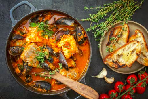 美國西岸加州一帶盛產海鮮,且相對偏好無負擔飲食,油炸食物沒有其他地區受歡迎。燉海鮮湯是融合了義式風格的加州料理,以魚、番茄、紅酒為湯底,內容包含蝦、蟹、魷魚、貝類等滿滿的海鮮,一般會配著麵包一起吃。