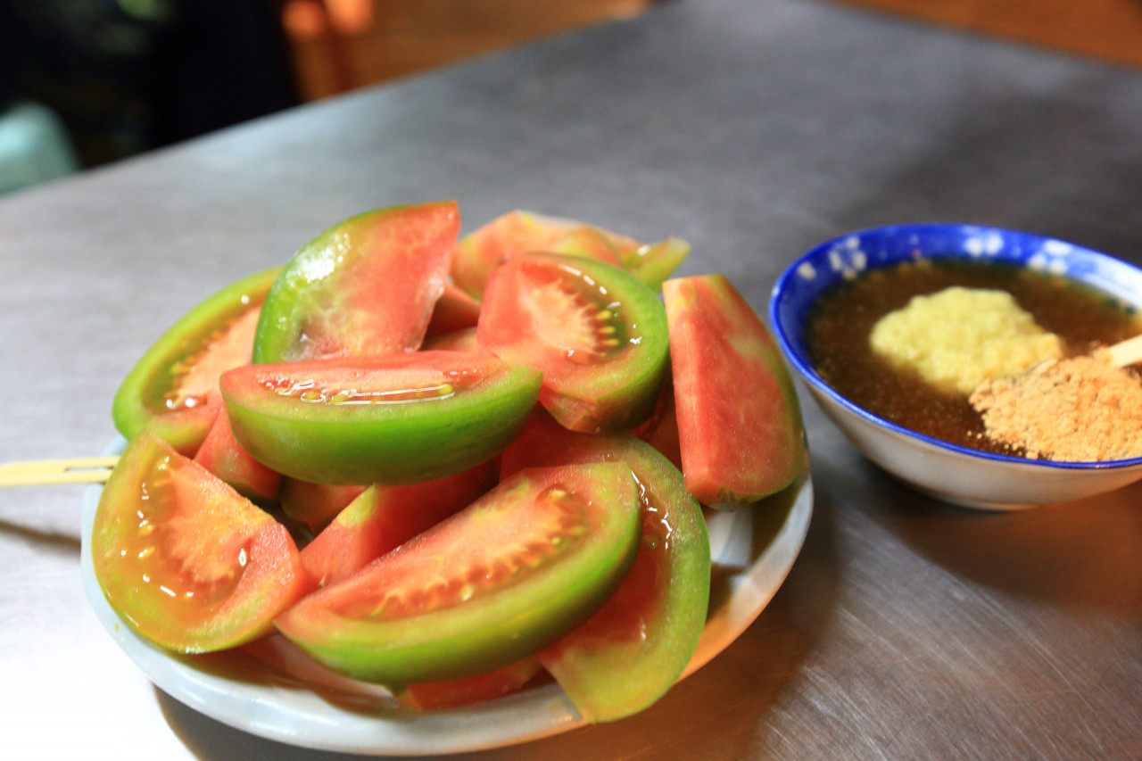 吃完正餐,就剛好可以點一盤冰鄉水果店的薑糖番茄來當飯後水果。番茄蘸上這一碟由薑末、甘草粉與糖調和成的古早味醬汁,最適合在飽足一餐後一口接一口地享受,這是最正宗的南部番茄吃法了!