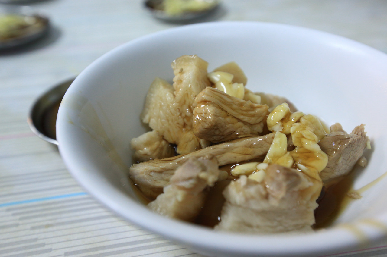 蔡阿嘎要特別推薦的是這碗骨髓湯與蒜泥豬腳,滿滿一碗的骨髓,老闆阿文真的是下料完全不手軟,讓平時超愛吸羊大骨髓的阿嘎,一口氣享受這一大碗豬骨髓的肥嫩滋味;蒜泥豬腳也是處理得相當漂亮,豬腳皮吃起來是脆脆的口感,蒜泥醬配著冬粉吃更是對味。