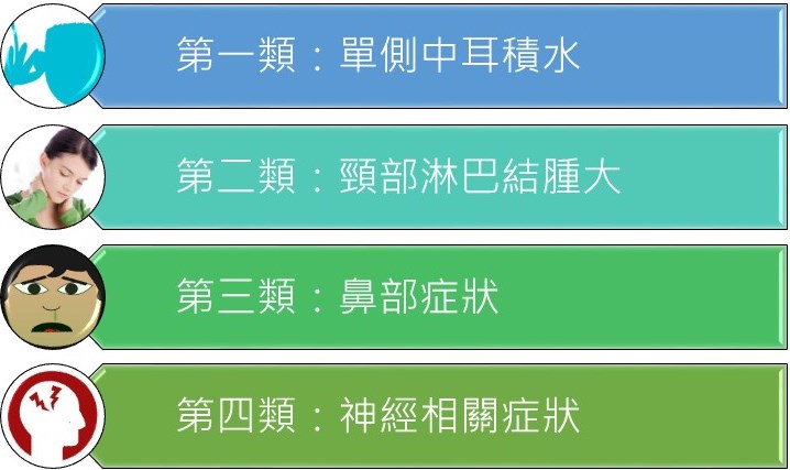 許瑛倢醫師表示,鼻咽癌原發位置在鼻腔的後方,初期腫瘤較小時,不會痛也不易感受到異常。但是,鼻咽癌的症狀還是可約略分為如下四大類,若及時警覺到這些症狀可能和鼻咽癌相關,進而及早進行檢查,提早診斷。