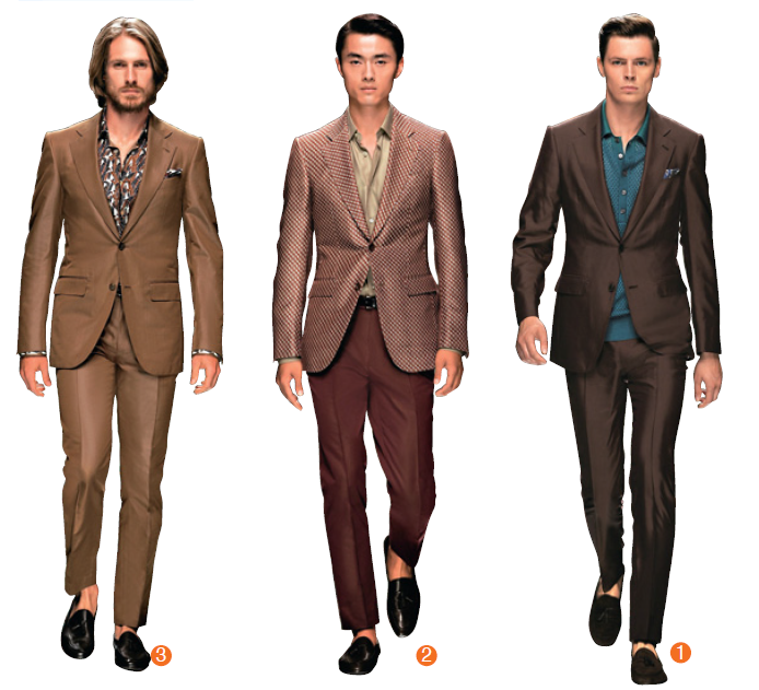 Ermenegildo Zegna本季首推以棕色系為主軸的絲光套裝,運用熱帶印花襯衫為棕色套裝帶來夏日新風情;又或成套勃根第紅西上裝與褲子,再以煙藍色襯衫劃破整體搭配的沉悶感,與襯衫互為輝映的袋巾小細節,更說明了男人的品味;精采的印花西上裝,選擇印花圖案色系之一作為西褲選色,襯衫為同色階襯托出穿搭層次。