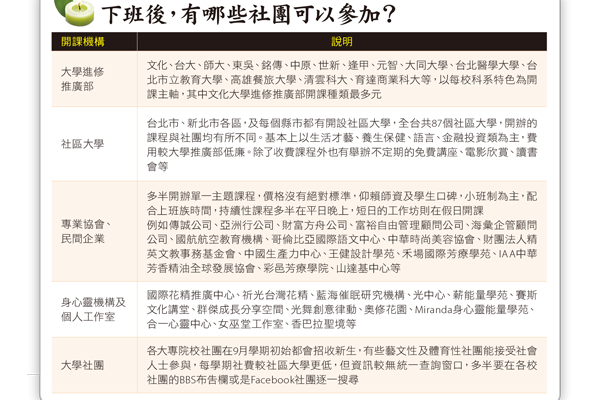 屬於上班人士的社團和課程,成員都來自於不同領域、不同行業,是另一種跨領域的交流,大大延伸人脈和吸收新知的觸角。